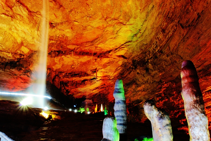 黃龍洞因相傳古代洞內(nèi)有黃龍藏身而得名,1983年經(jīng)當(dāng)?shù)?個青年民兵發(fā)現(xiàn)探明,1984 年正式對外開放。因洞內(nèi)擁有高闊的洞天、幽深的暗河、懸空的瀑布、上千個白玉池、數(shù)萬根石筍。