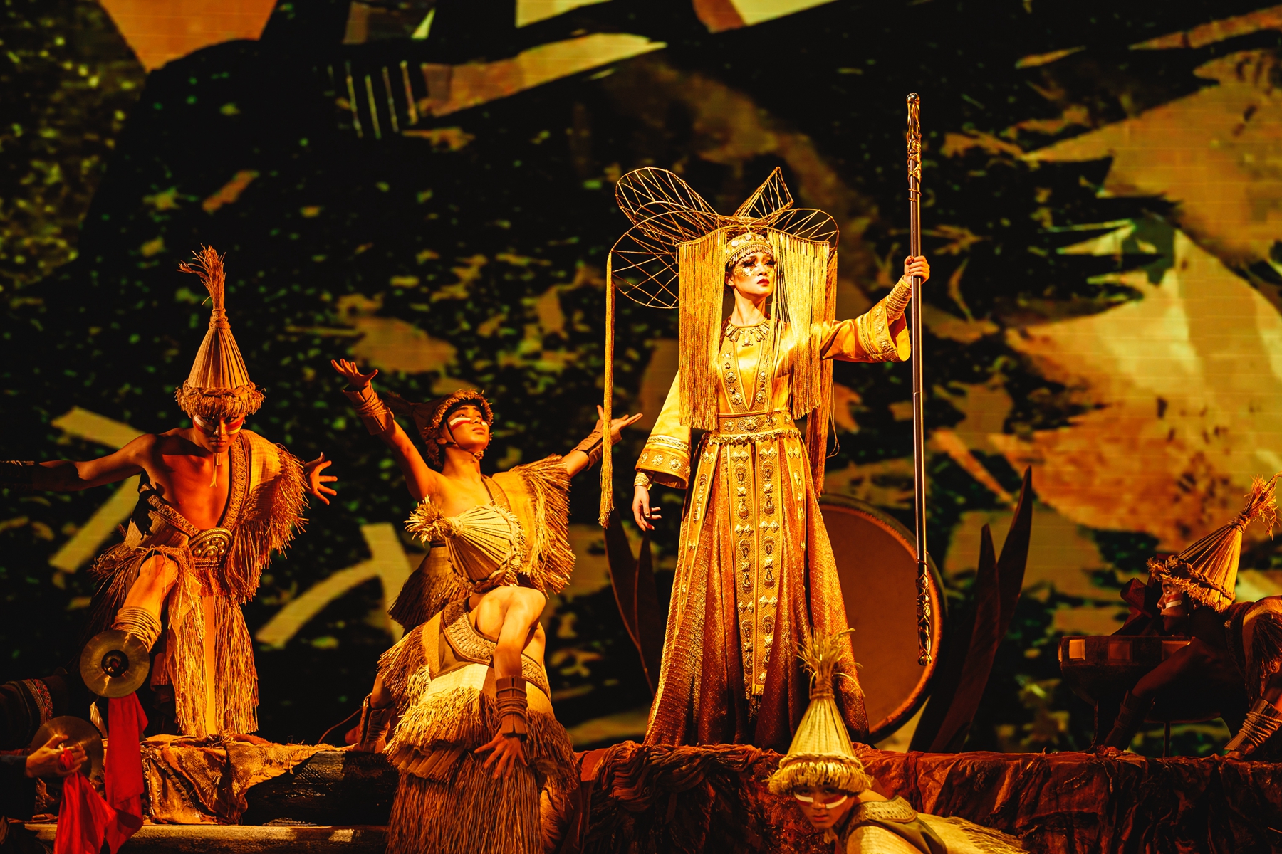 強(qiáng)勁的節(jié)奏在祠堂上空響起,赤裸上身、身著原始草裙的村民肅立成陣,跳起了土苗民族的茅古斯舞;舞臺中心的升降臺載著裝扮華麗神秘的女祭司慢慢升起,作為這場儀式的指揮,她的吟唱仿佛統(tǒng)領(lǐng)著整個(gè)森林山谷中的所有神力......